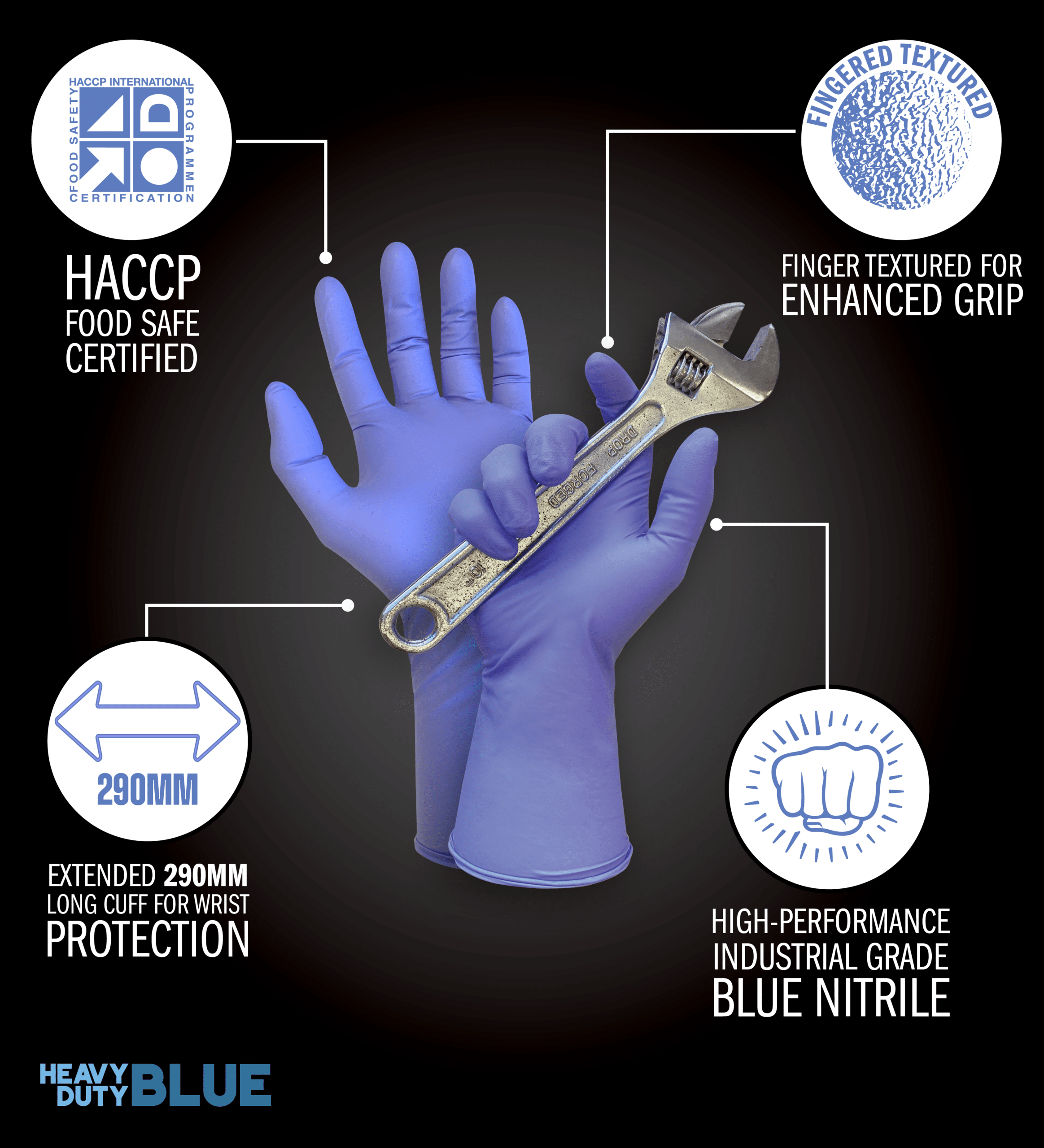 Heavy Duty Blue Nitrile Disposable Gloves are crafted from a strong heavy-duty nitrile material that is finger textured. The incredibly tough Heavy Duty Blue Nitrile Disposable Gloves are designed for the automotive, industrial, building, coatings & mining sectors.
