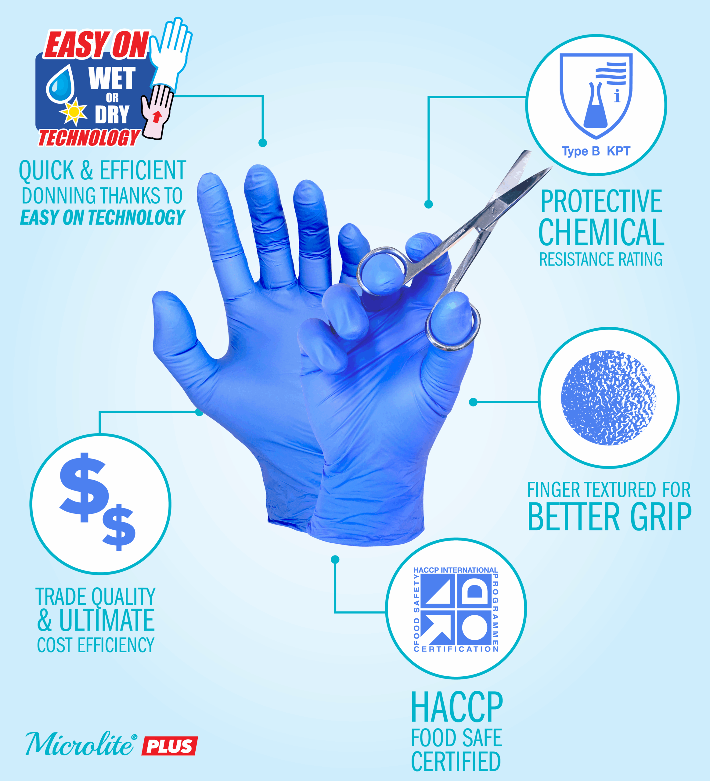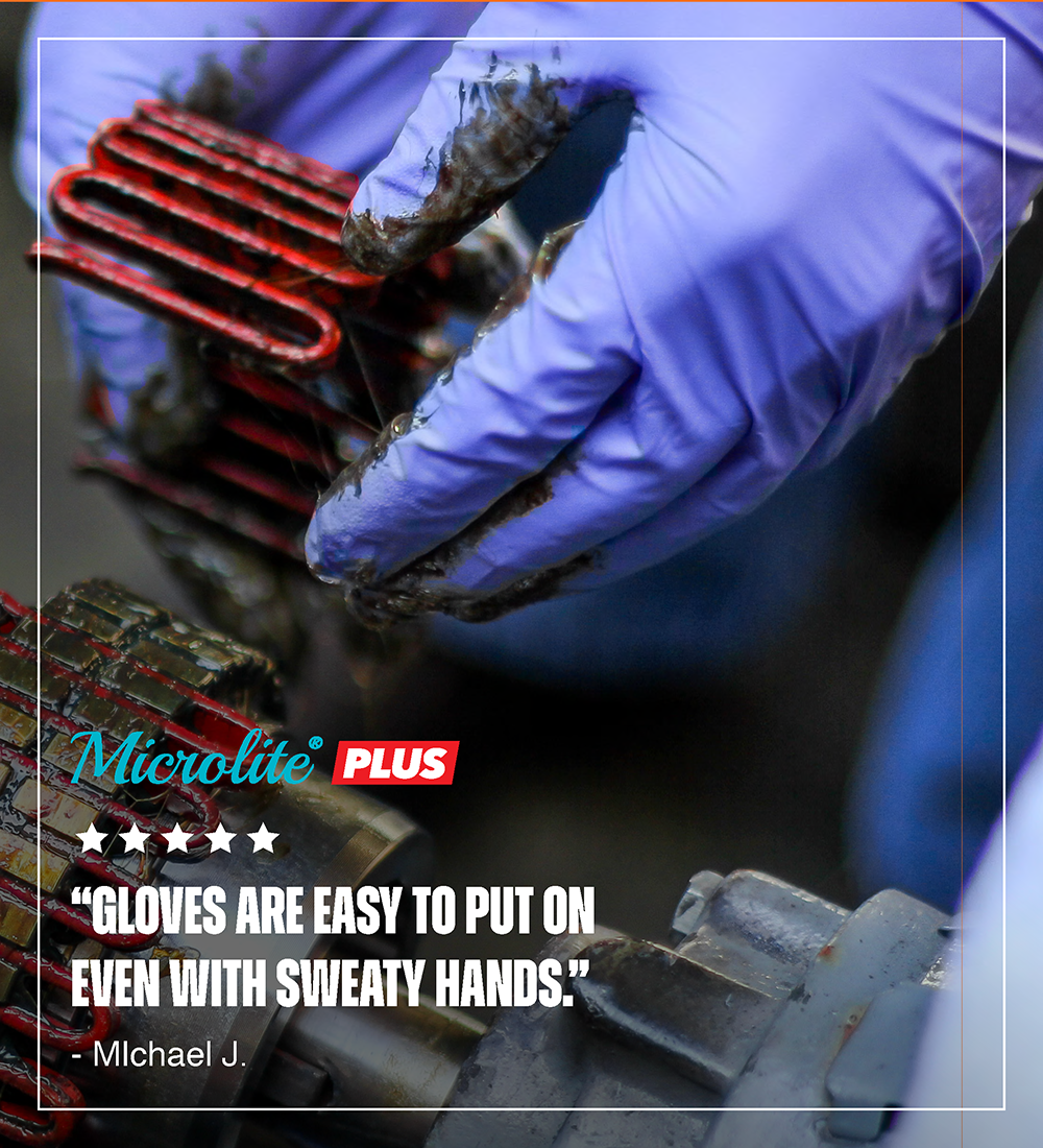 Whether you have Dry hands, Hot Hands, Damp Hands, Sweaty Hands or Wet Hands, it won’t matter anymore! Because with EASY ON  Technology the glove is easy to put on, no matter what. Microlite® PLUS feature textured fingertips, giving you a super lightweight easy donning glove.